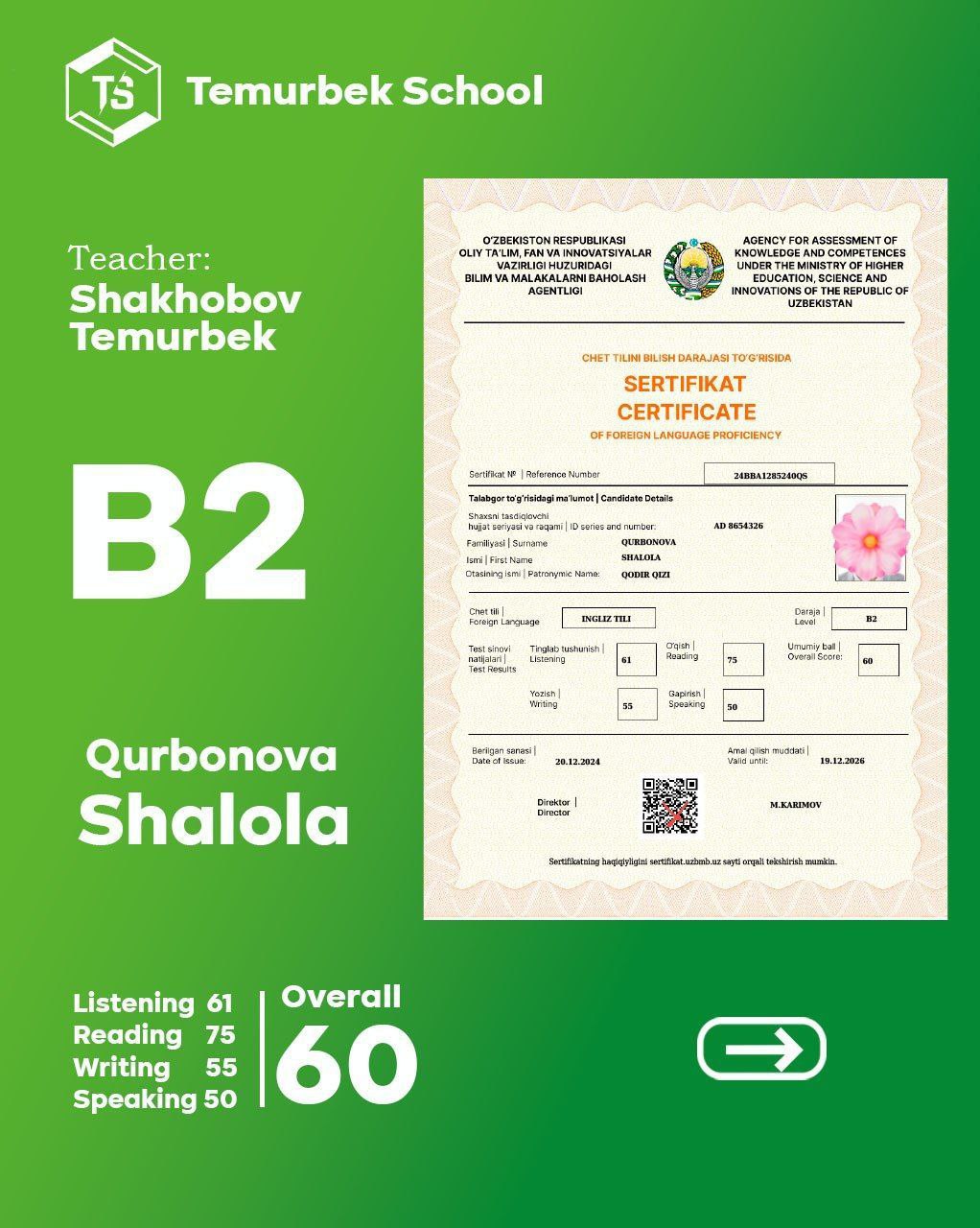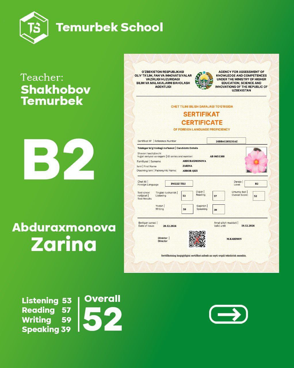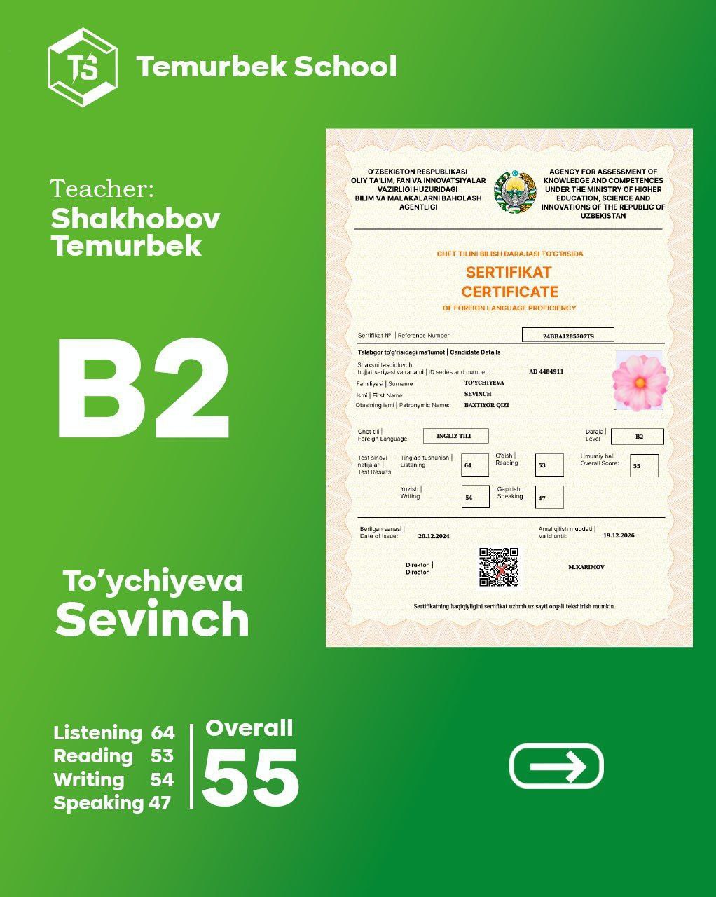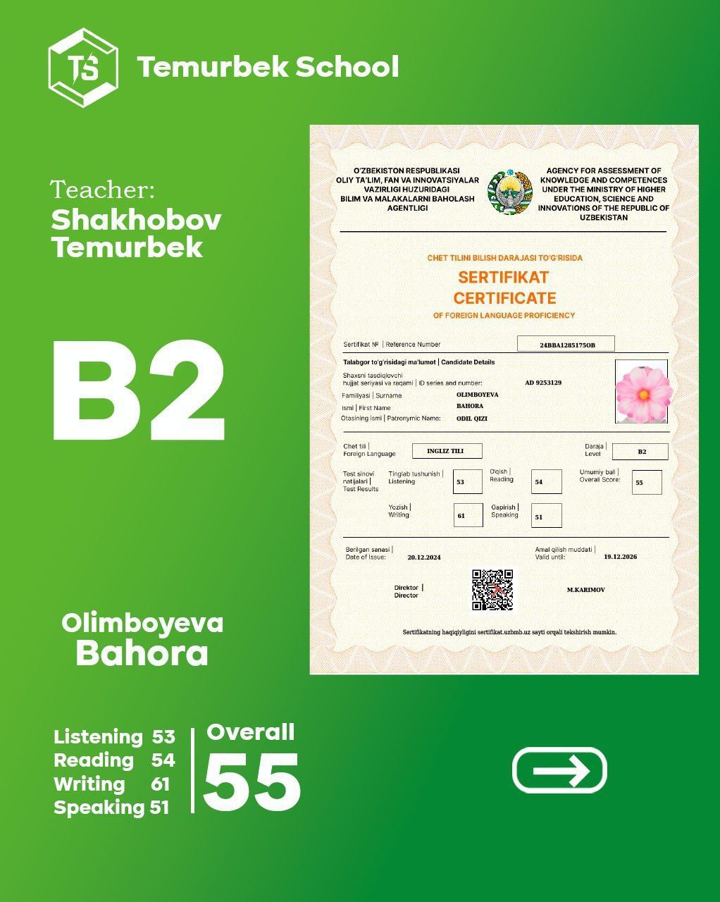 Bizning CEFR Testidan yaxshi nartija erishgan o'quvchilar